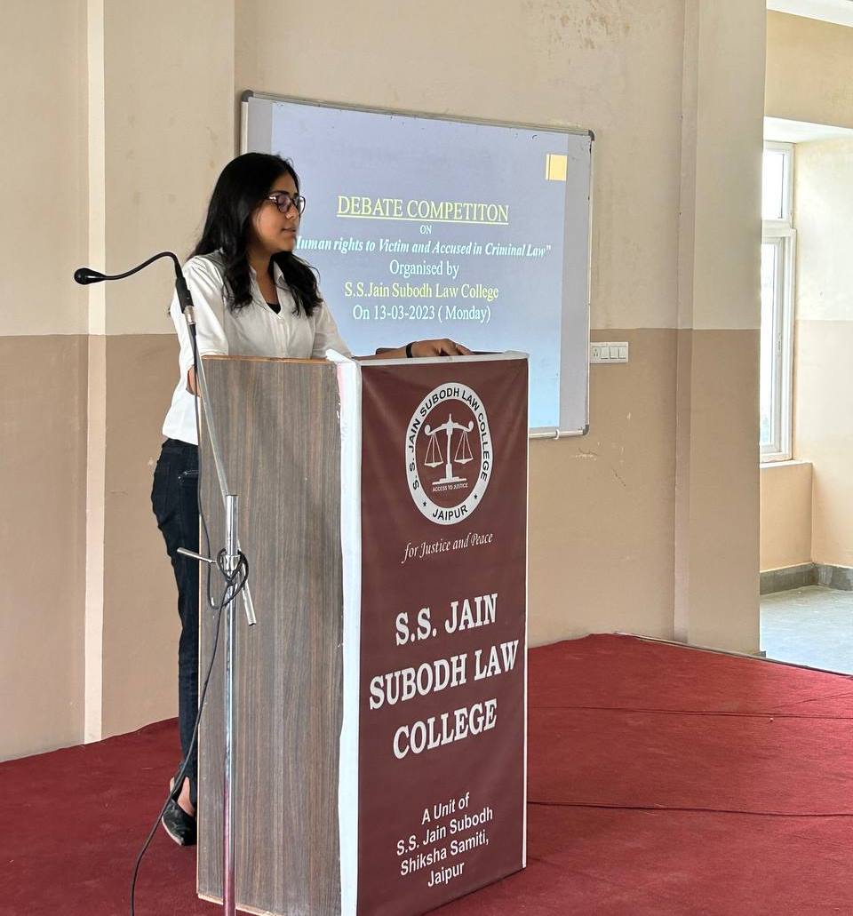 On the 13th of March, 2023, a successful debate competition was held in the premises of S.S. Jain Subodh Law College, Jaipur. The topic of the competition was "Human Rights to Victim and Accused in Criminal Law." The event was organized by the cultural committee of the college along with the students under the guidance of the Vice-Principal.
